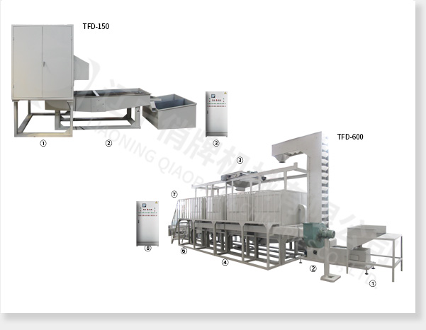 TFD-600型: 上料斗 ② Z型提升機(jī)  喂料小車  脫皮機(jī)(4臺(tái))  送料篩(2臺(tái))  除糠篩和分選篩  排塵系統(tǒng)  電氣控制柜