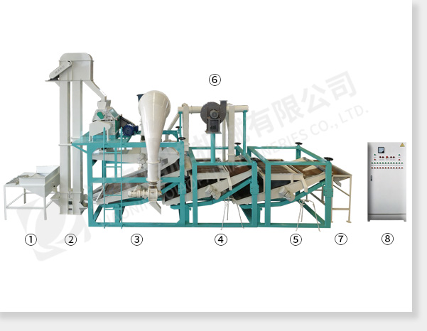 ① 上料斗② 斗式提升機 ③ 脫殼、風(fēng)選、分選主機 ④ 籽米復(fù)選機1 ⑤ 籽米復(fù)選機2 ⑥ 風(fēng)力回料系統(tǒng) ⑦ 接料斗 ⑧ 電氣控制柜